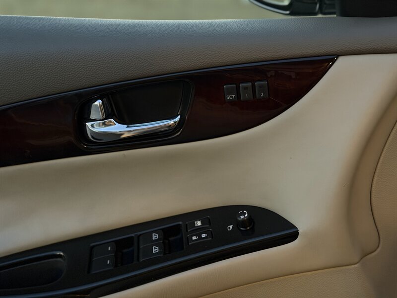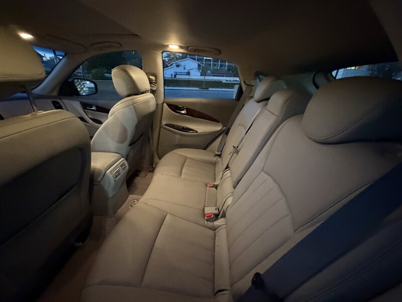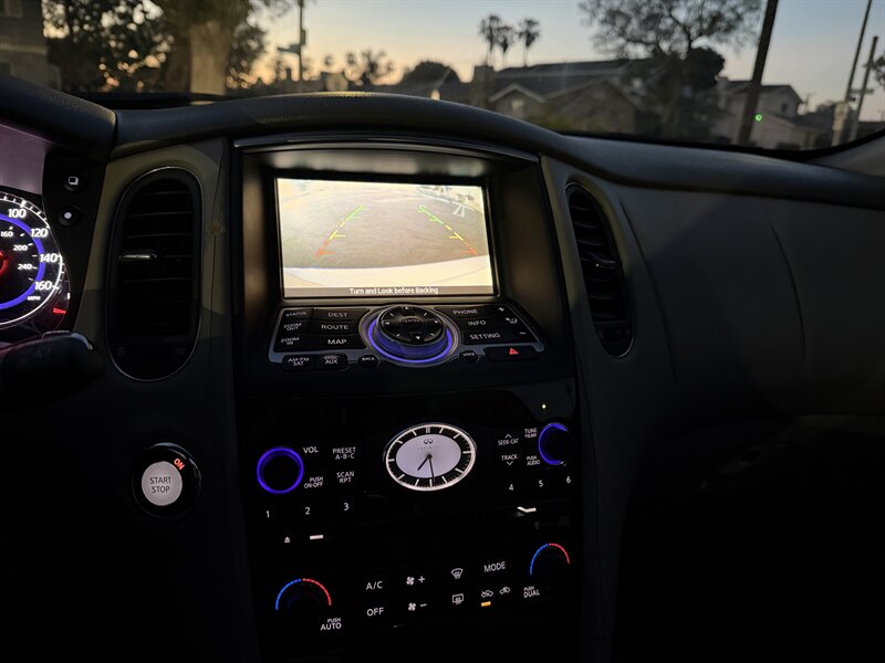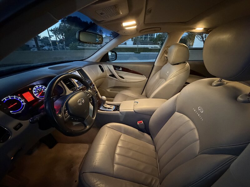 2008 INFINITI EX35 in Black with a Black interior, powered by a 3.5L V6 producing 297 hp and 253 lb-ft of torque. Factory-standard equipment typically includes leather-appointed heated front seats with power adjustments and driver memory, dual-zone automatic climate control, power tilt/telescoping steering column, sunroof, keyless entry with push-button ignition (Intelligent Key), steering-wheel audio and phone controls, AM/FM/CD/MP3 with auxiliary input (Bose premium audio and navigation were available options), 18-inch alloy wheels, HID headlights and fog lamps. Safety and convenience features include ABS with electronic brake-force distribution and Brake Assist, Vehicle Dynamic Control/traction control, multiple airbags (front, side and curtain), tire pressure monitoring and available rear parking sensors/backup camera. This EX35 has good mileage (below 150,000 miles, averaging under 8,000 miles per year), is in excellent overall condition, and averages 17 MPG city / 24 MPG highway. Rear-wheel drive was standard; all-wheel drive was a factory option.